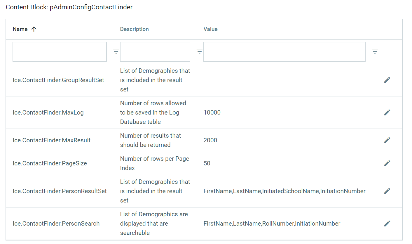 The contact finder configuration settings define the default limits on several parameters and the fields displayed in the finder. It is recommended that you define ICE Demographics for each field used and then define these settings (see Demographics section). You can also customize the contact finder settings per page within the Sitemap > Contact Finder tab.