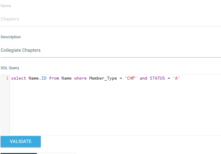 Roster queries should return distinct iMIS ID only. Use the Validate button to confirm your query is working as expected.