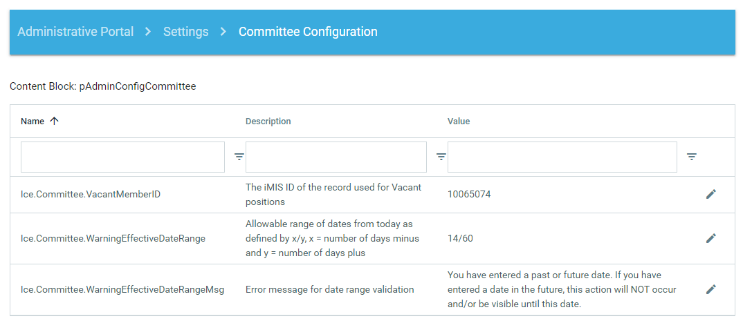Vacant Member ID: The default value for a vacant position. The vacant position record is used as a placeholder until a new leader is assigned. When a user sets a position to vacant, an iMIS id is placed in the position. A record in iMIS with the first and last name of Vacant Position should exist in your database. Insert the iMIS ID that was assigned as the "Value" in ICE.