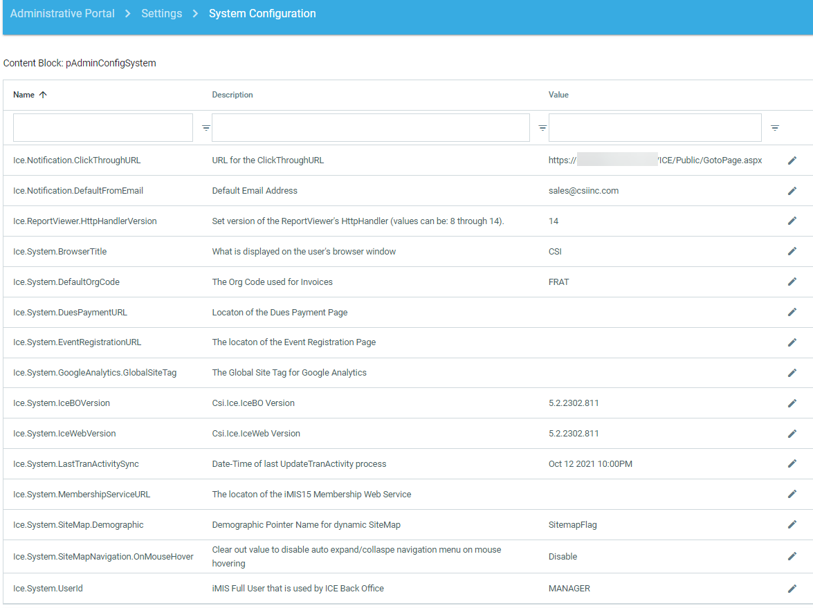 The system configuration page is used to define the organization name, database version, and code versions. It is generally for development reference purposes only but there are some areas that may require updates, such as: