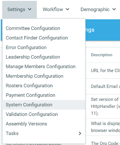 The settings area contains the constant values for a number of functions throughout the site. The menu is organized by module to which the settings apply. Settings can be defined for committees, contact information, error handling, membership, rosters, system values, validation handling, and tasks. The majority of the settings are pre-loaded with default configuration values, however new configuration options can be defined.