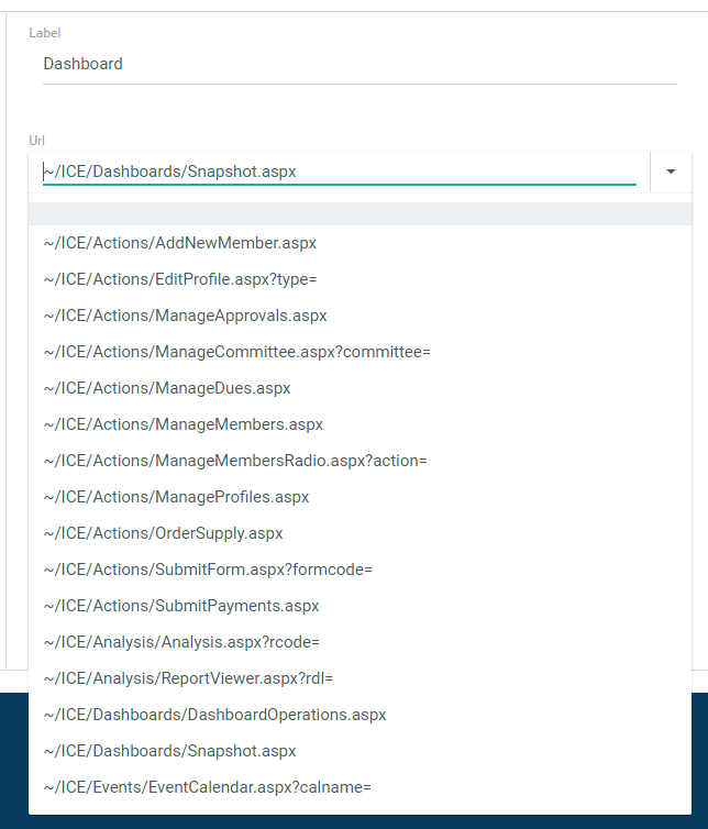 URL: URL for menu item (Note that some URLs require a parameter). A URL from the list does not have to be chosen. A non-ICE URL can be inserted.