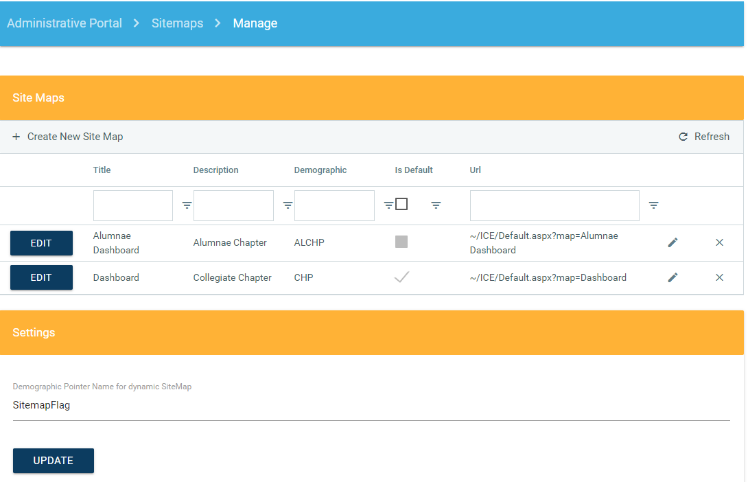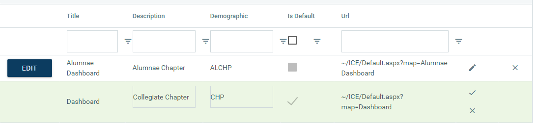 You can update the Description and Demographic fields as desired. The Demographic field represents the expected value for the demographic pointer you are using to make the sitemap dynamic. Typically member type is used. Select the Check to Update and save changes or X to Cancel and disregard the changes.