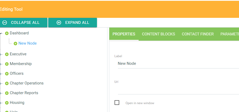 A node will be created underneath the selected parent node. The properties of the new node will then display to the right. Each new node created is given a default label of "New Node"