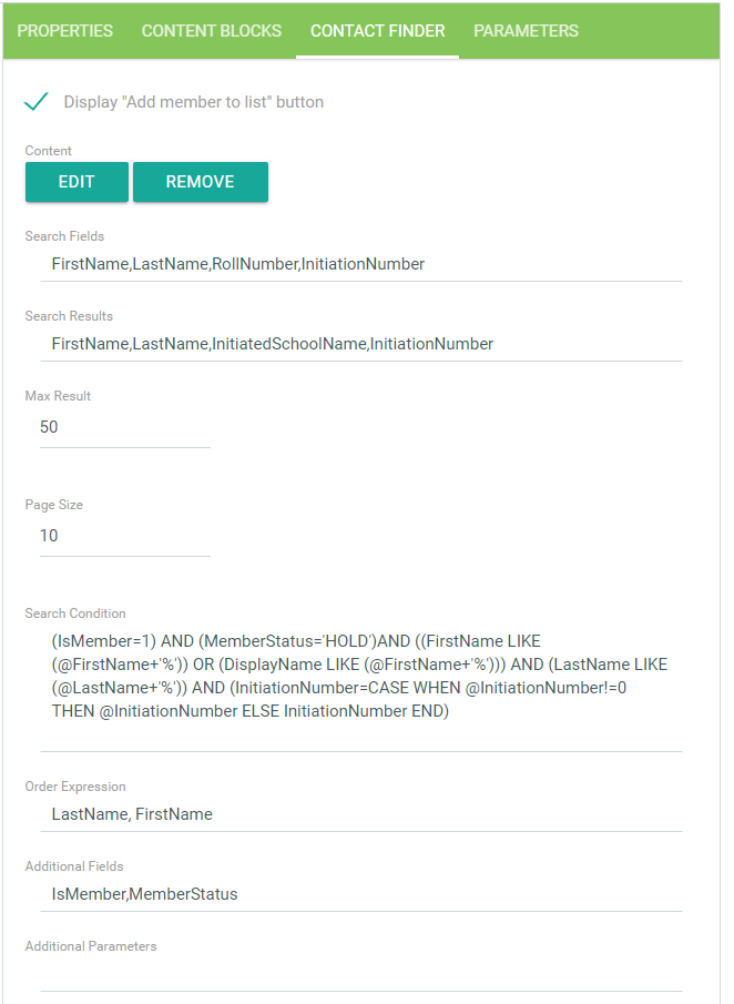 Additional Fields and Additional Parameters are used in conjunction with the Search Condition. The Additional Fields values help the Contact Finder to identify additional demographic definition fields used in the Search Condition that would not appear in the Search Fields or Search Results.