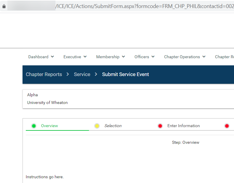 The ICE user will log in and default to their chapter's ICE page and the first step of the submit philanthropy event form.