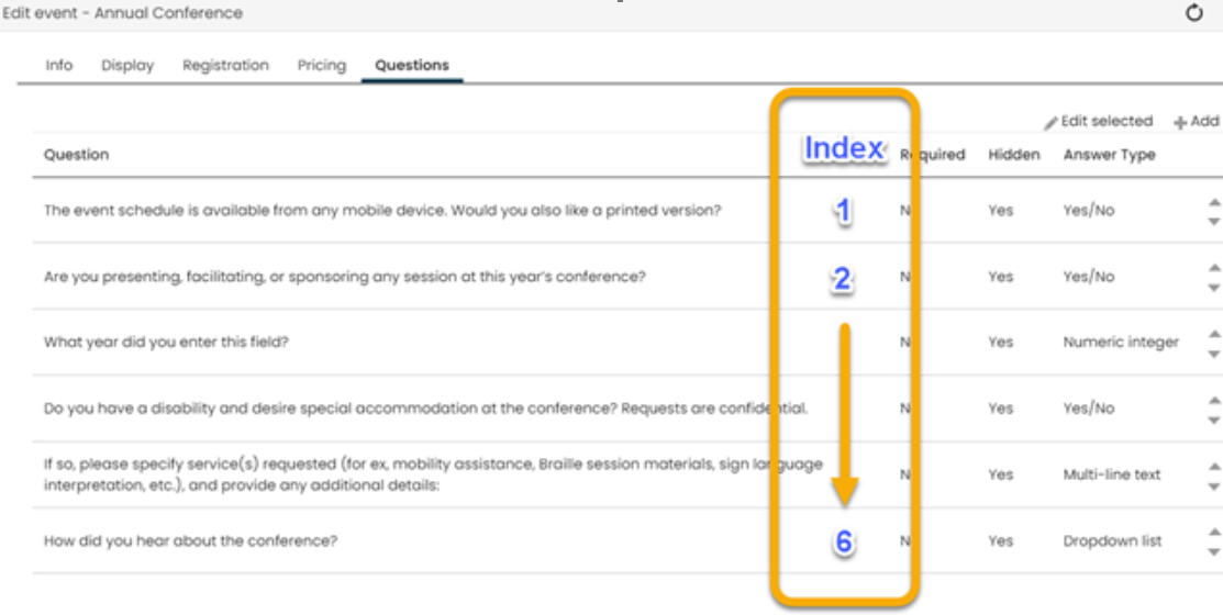 The question index always starts at the top with 1 and represents the question number position. If you move questions around, the index will still go from top to bottom. You can also get the question index number by querying the FormDefinitionFieldData source. These indexes will start from zero instead of one, so add 1 to each index from the query.