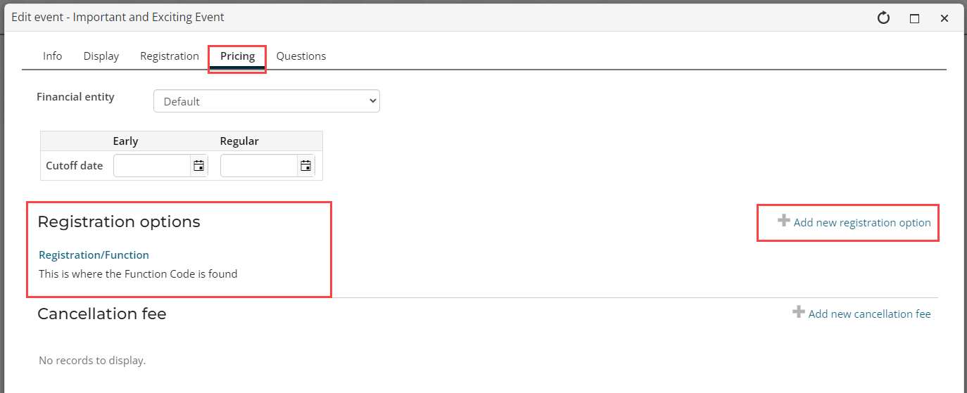 Function Code - This code determines the registration option that the ID will register for (specific). Found under the "Pricing" tab > Registration options. Event functions can also be referred to as program items.