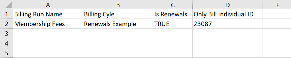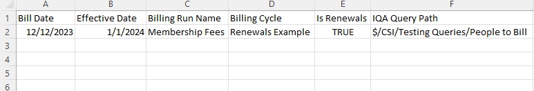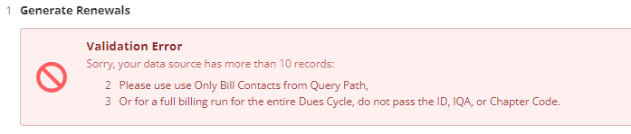 Only Bill Individual iMIS ID - Member iMIS ID for single contact to generate renewal for. If the spreadsheet or IQA query has more than 10 records, a validation error will occur.