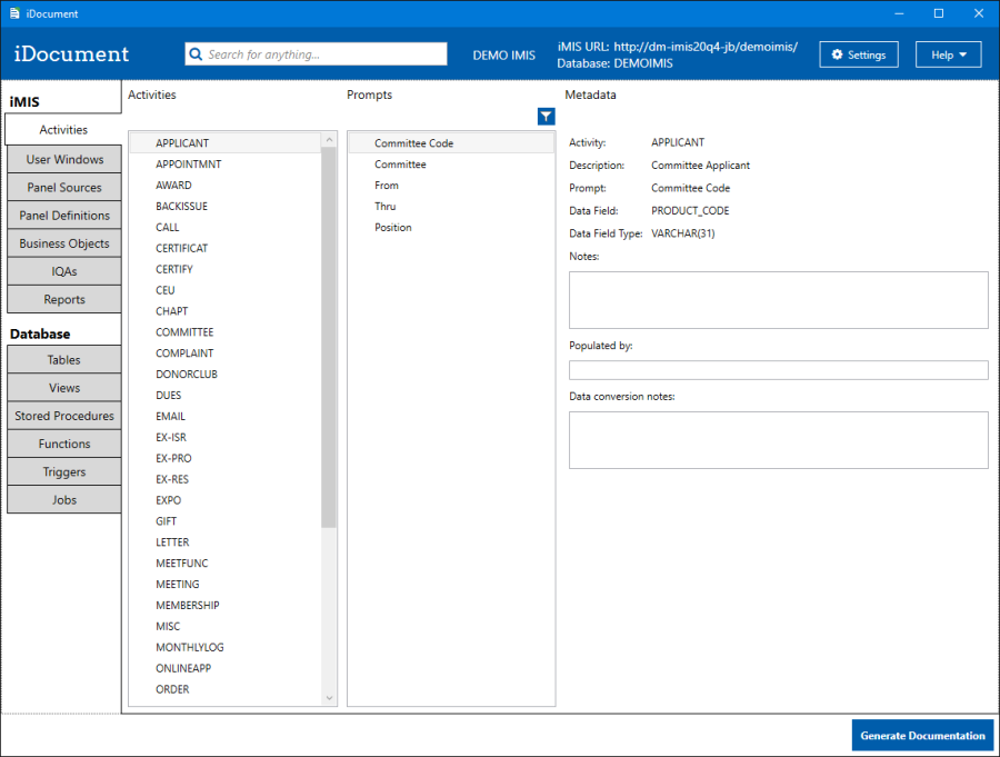 iDocument is an application designed to assist technical staff with documenting their iMIS and database instances. It allows you to associate notes and other metadata with various entities in iMIS (i.e. Activities and IQAs), or objects in the database (i.e. Tables or Jobs). iDocument can also generate a documentation file containing all of the notes that have been entered, which you can then save as an .html file and include in a website.
