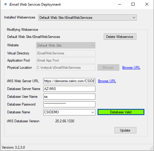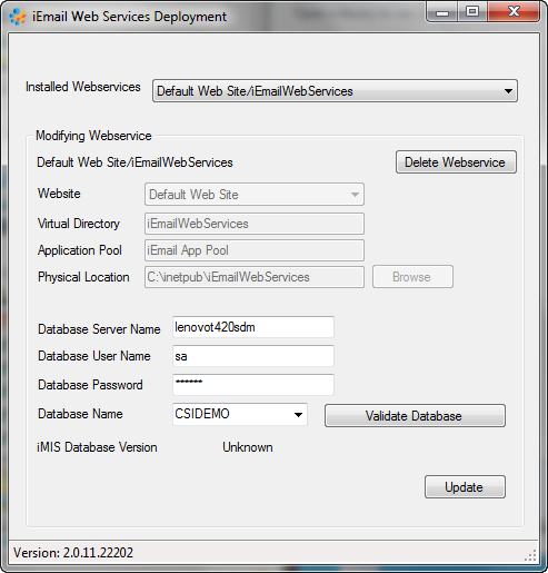 The iEmail Web Services Deployment Program will enable you to create, administer, and delete the iEmail Web Service. The dropdown at the top ("Installed Webservices") will show you what web services are currently installed. If you select "Add New Webservice", you will be prompted to enter the fields required for adding a new web service (such as for your Test iMIS).