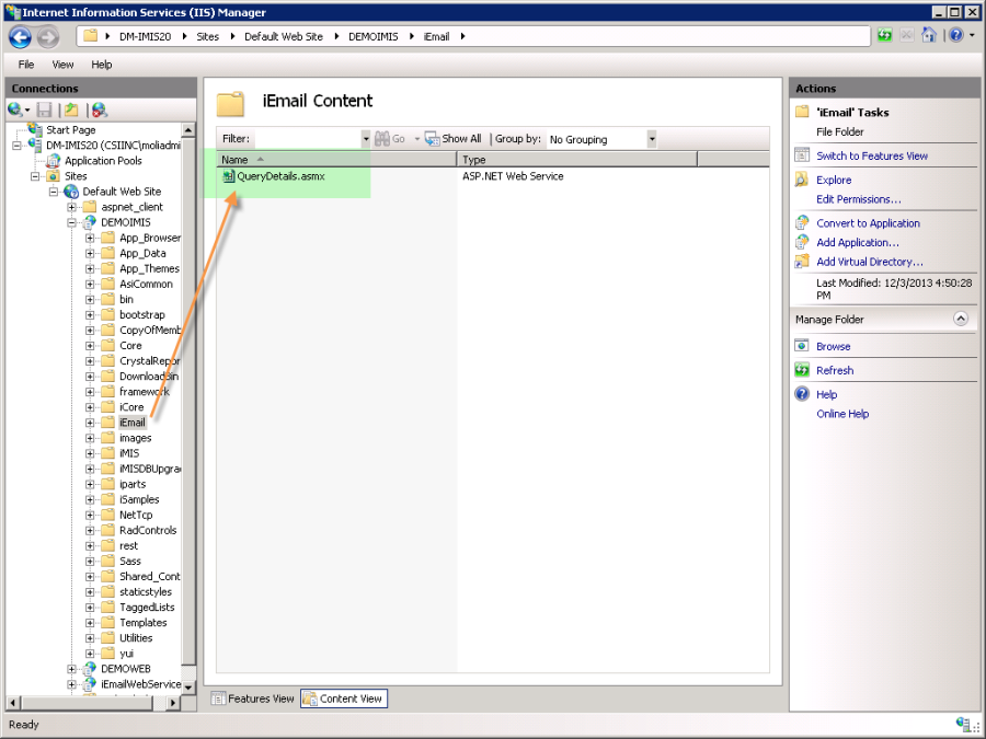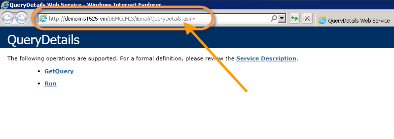 On the server, using a browser such as Internet Explorer, browse here: http://localhost/DEMOIMIS/iEmail/QueryDetails.asmx