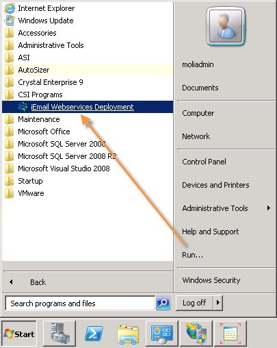 Once the program has been installed, you will see a program called "iEmail Webservices Deployment" under the CSI Programs folder in All Programs. Click on this to begin the installation of the iEmail Webservice. You must run the deployment tool after installing it!