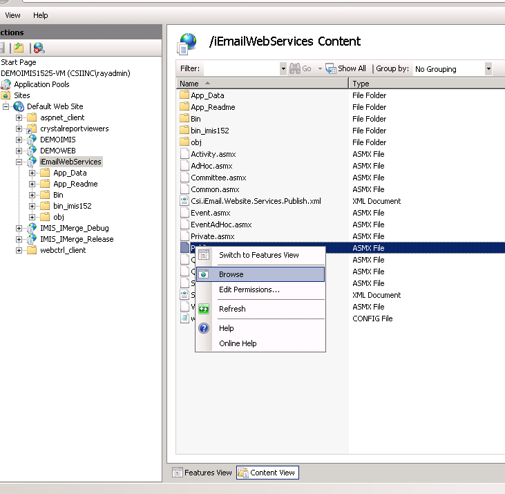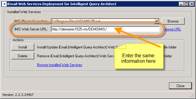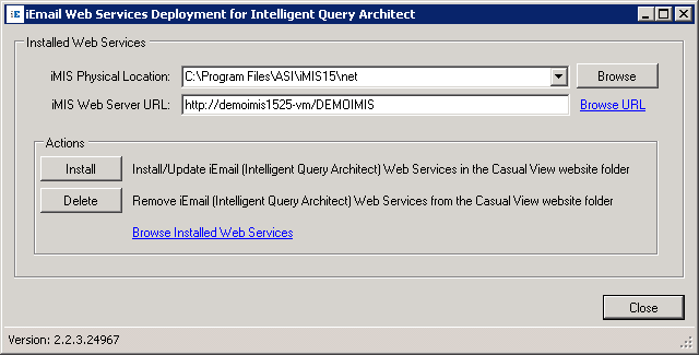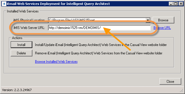The (IQA) web service for iEmail will typically be installed on the local web server where iMIS casual view website is installed. The iEmail web services need to reside exactly on the same folder where iMIS is installed.