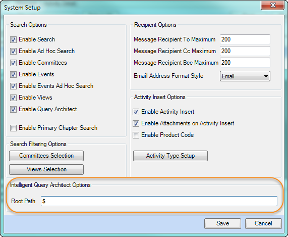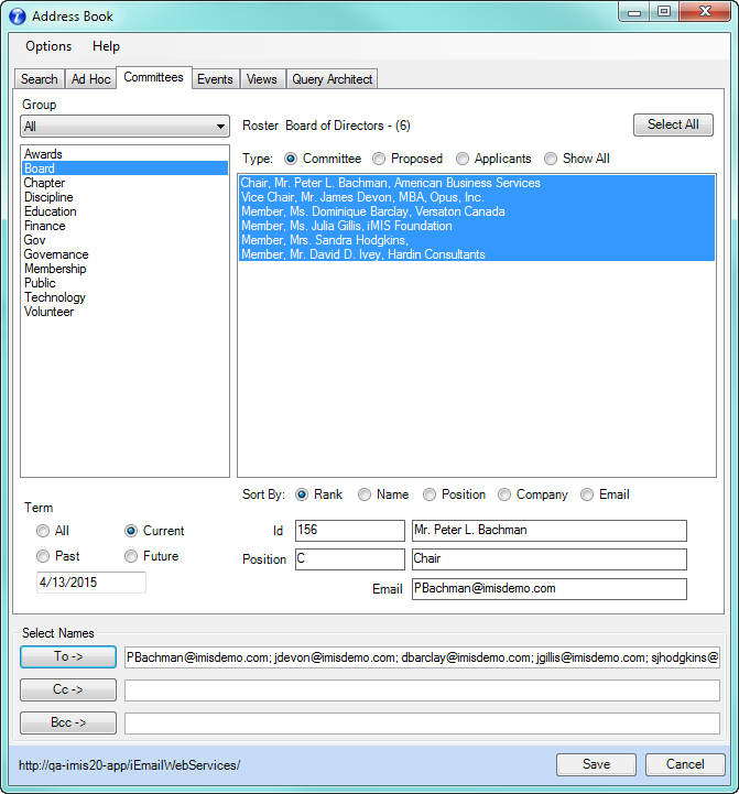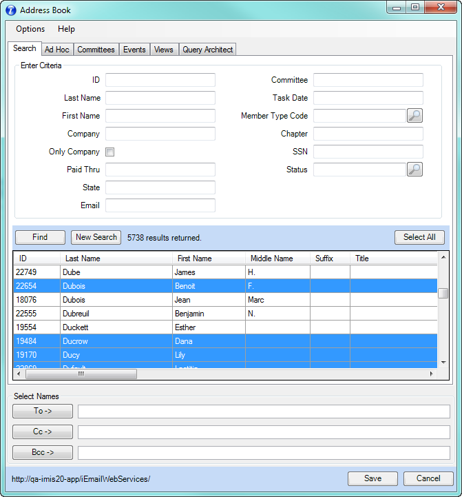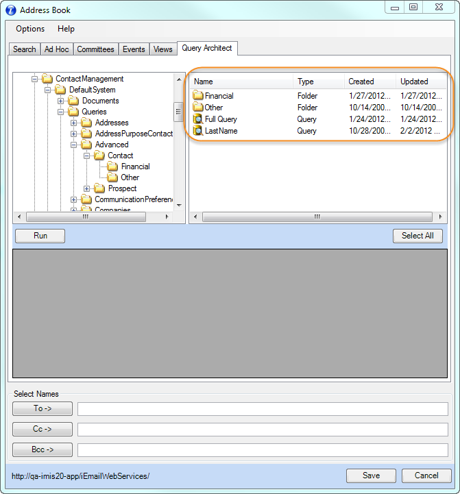 In order for the Intelligent Query Architect (IQA) tab in iEmail (Address Book from new mail message) to operate properly, you need to install the iEmail (IQA) Web Services at the same location as the iMIS casual website and then configure the regular iEmail Web Services settings to indicate what the iMIS casual website URL is.