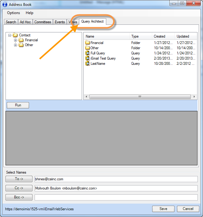 For the Intelligent Query Architect to work in the Address Book tab from iEmail, you need to install and setup the iEmail (IQA) Web Services and also configure the iEmail Web Services Deployment tool.