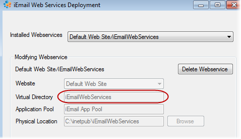 Physical Location: Actual installed location of the iEmail Web Service. We recommend leaving the default of 'C:\inetpub\iEmailWebServices'