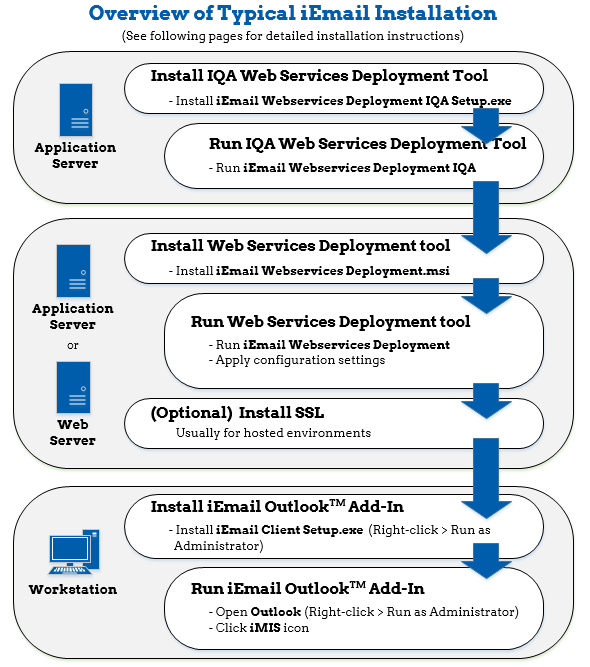 The web service for iEmail will typically be installed on the local web server. However, for some installations, there might be just an application server. This is fine, however the server needs to have IIS installed and running and must be able to communicate effectively with the SQL server.