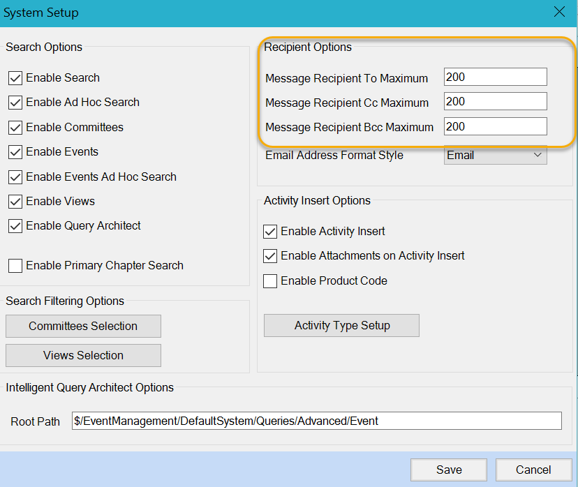 Since Outlook is not a mass emailing tool, iEmail allows the System Administrator to limit user access in the iMIS database and set limits on the number of recipients allowed to receive emails at one time.