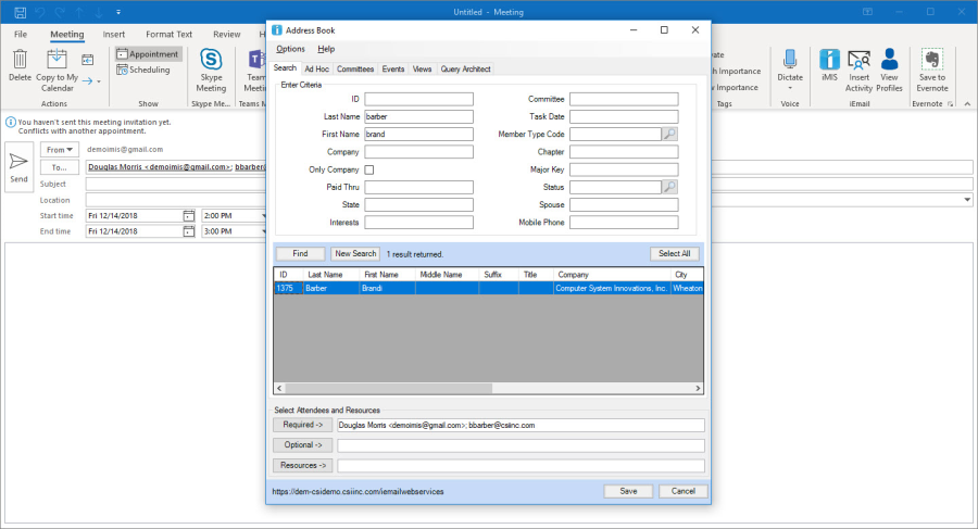 To search the iMIS database for email addresses and add them to the To, Cc, or Bcc fields in Outlook™