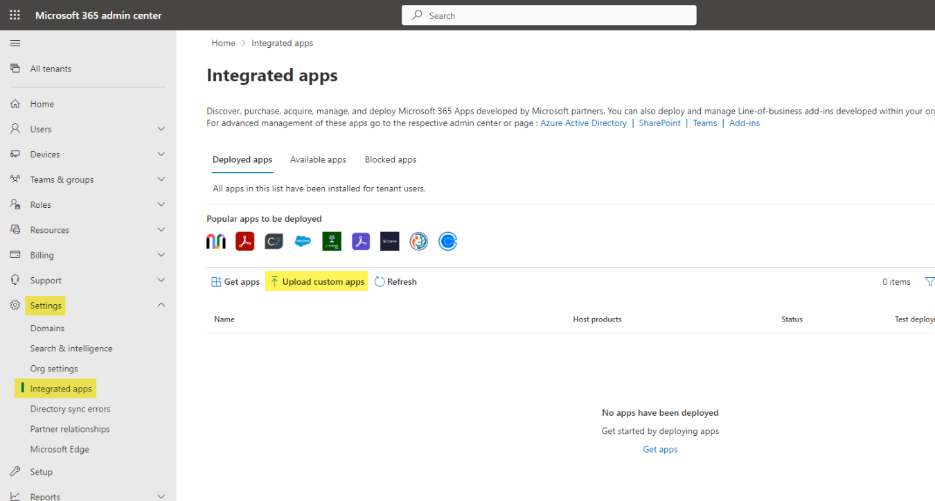 Navigate to Settings > Integrated Apps, and click Upload custom apps.