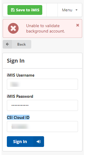 To correct this, please open a browser and go to cloud.csiinc.com. Once you’ve logged into your portal, on the left sidebar under ‘General’ is ‘My Account.’ Click that and in the center under ‘Account Info,’ click the ‘Update My Account Info’ button. Once that’s open, on the left side is ‘Background Account.’ Add the new iMIS Manager Password and then click ‘Save Changes’ below.