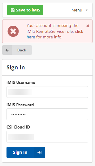 "Your account is missing the iMIS RemoteService role"