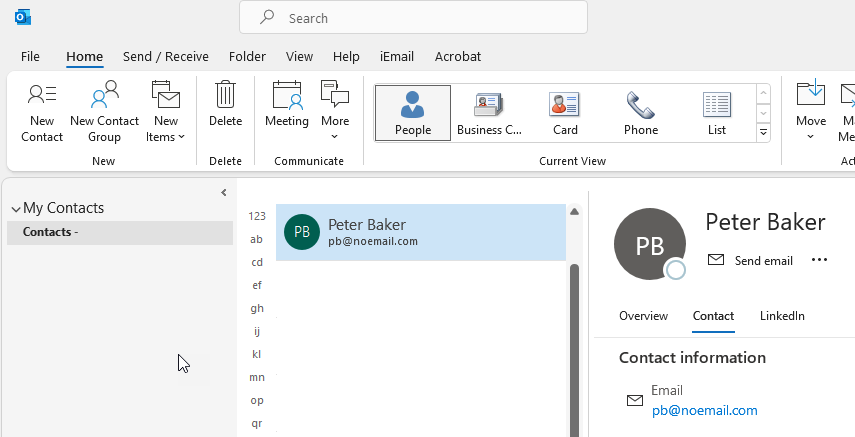 Example: I have a Contacts list in Outlook which contains an entry for Peter Baker with an email address pb@noemail.com: