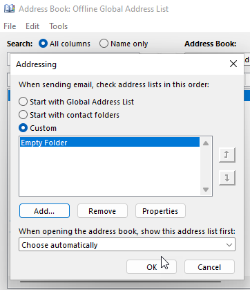 Click OK. This will cause Outlook to only look in the Empty Folder for matching names where it will not find anything to replace.
