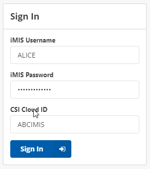 To sign in, enter your iMIS username, iMIS password, and your CSI Cloud ID which you received from CSI or from your IT or Network Admin, then click the blue Sign In button.