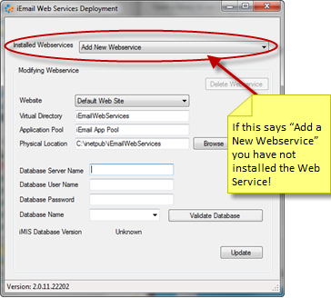 The iEmail Web Services Deployment Program will enable you to create, administer, and delete the iEmail Web Service. The dropdown at the top ("Installed Webservices") will show you what web services are currently installed. If you select "Add New Webservice", you will be prompted to enter the fields required for adding a new web service (such as for your Test iMIS).