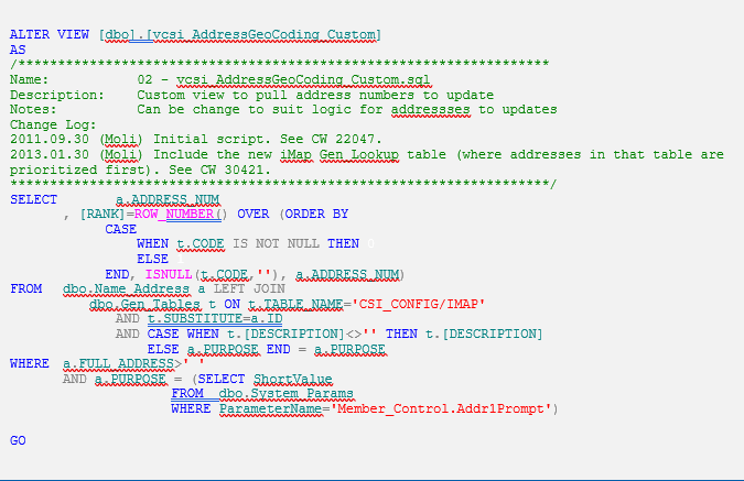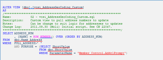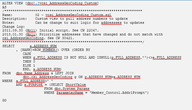 iMap installs a custom SQL view called: vcsi_AddressGeoCoding_Custom and relies on this view to get the iMIS addresses to be geocoded.