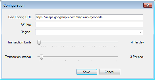 The Transaction Limits value is usually set to 1,300, depending on your license agreement with the Google© Geocoding API.