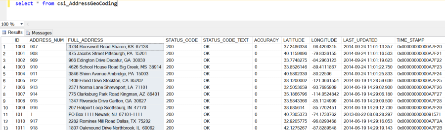 A custom SQL table called csi_AddressGeoCoding is used to store the geocoding results. It includes the following fields: