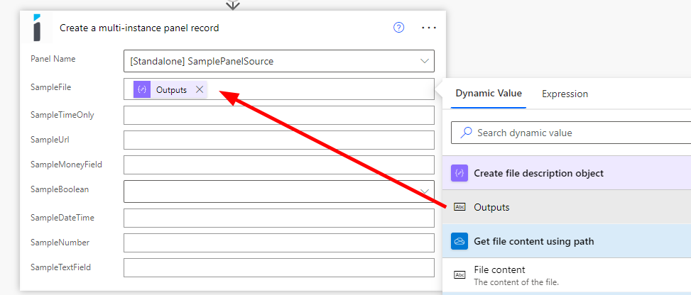 Once you have the three fields (File, File Name, and MIME Type), you can now use this "file object" inside of a "Create Panel" or "Update Panel" action.