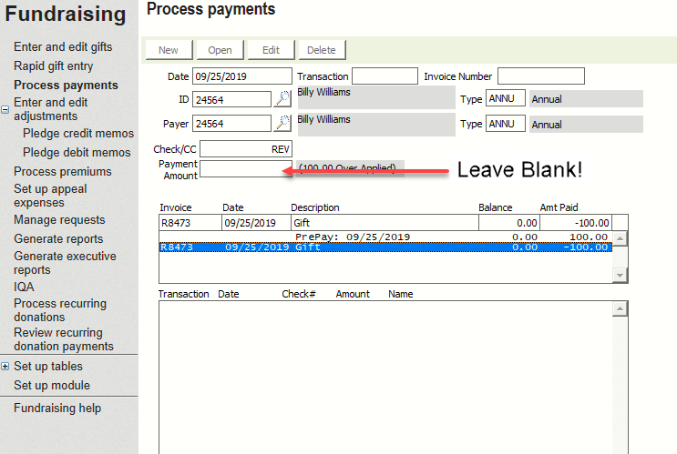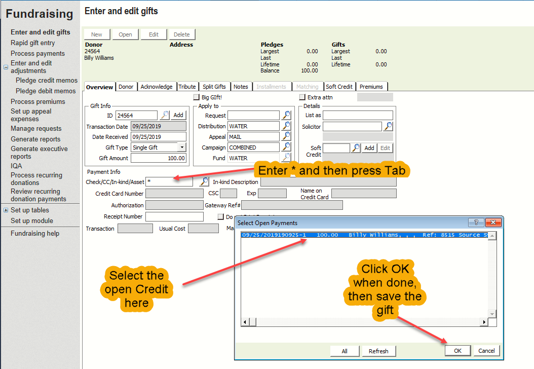 - Re-Enter the Gift Correctly, enter a * in the check # field and use the existing credit