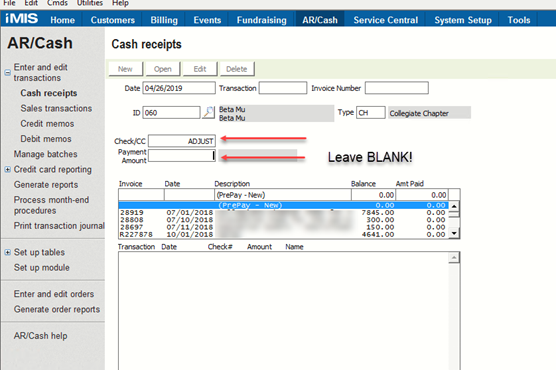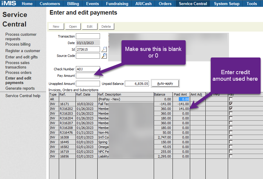 Note: This can be done in Service Central as well - but you must adjust the Payment Amount when applying the credits because iMIS will try to pay off the entire line. MAKE SURE THE AMOUNT FIELD IS ZERO before you hit OK.