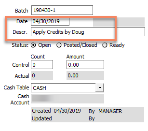 Because Service Central wants to “help” you apply full payments, it is not the best place to apply open credits to existing balances. CSI recommends you do this through AR/Cash, Cash Receipts.