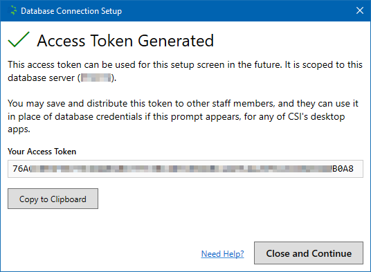 – The access token needs to be entered once per user, per machine. However, it is shared amongst all CSI desktop apps, so each desktop app does not need to be set up separately. Note that if the database credentials change, the prompt will appear again and a new access token will need to be generated and distributed to any necessary staff.