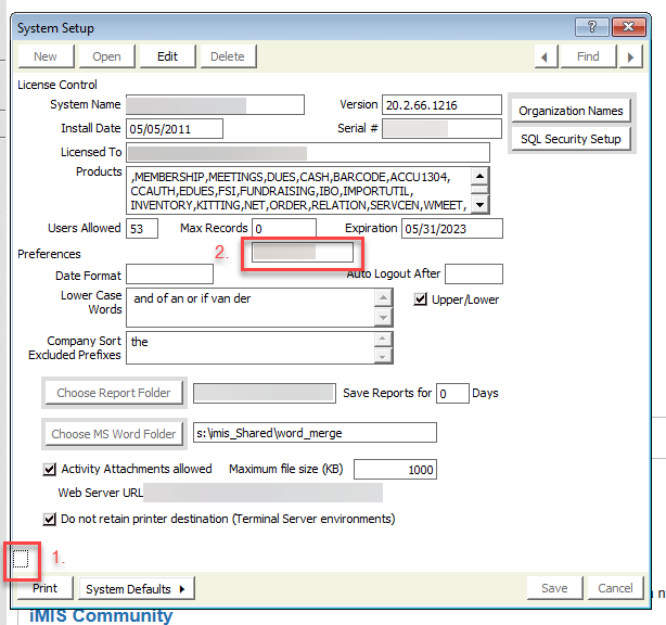 Once you have ensured all of the values are correct, hit the Save button at the bottom of the System Setup window. You will be prompted to exit iMIS desktop and re-open it. Log back into iMIS desktop to ensure the iMIS license has been updated successfully. iMIS desktop will not function correctly until the license has been validated.