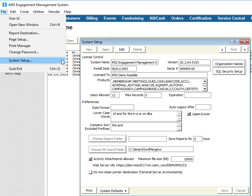 Login to iMIS Desktop > Go to File > System Setup