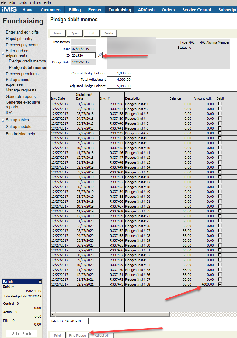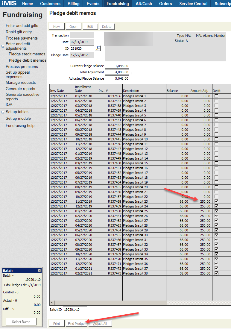 - Go to Fundraising > Enter and edit adjustments > Pledge debit memos