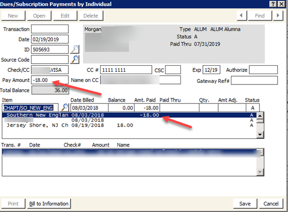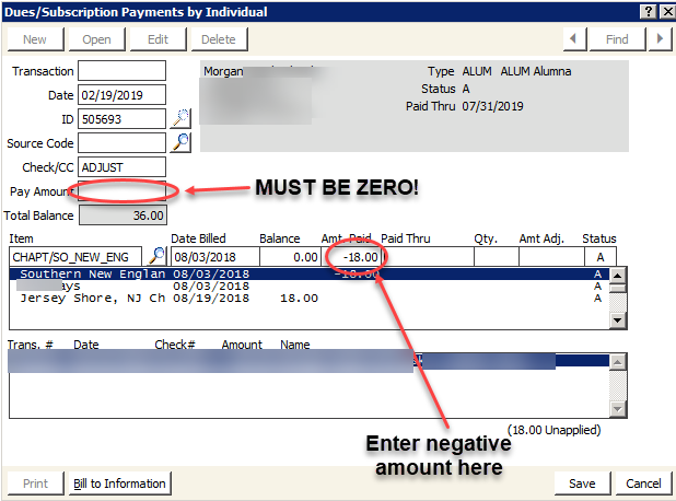 7. Depending on your system setup, if you have reversed the Primary Dues item, you will also want to erase the Paid Thru Date on the Profile or Status screen in iMIS. For Chapter payments, this would be rare.