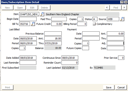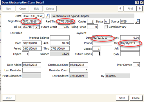2. Confirm the Dues/Subscription Item detail has been corrected. If not, follow steps 5 and 6 above.