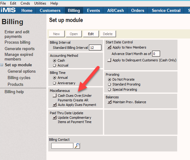 2. Confirm the 'Cash Dues Over/Under Payments Create AR' setting is enabled. Locate this setting under Billing > Set up module > Miscellaneous. If this is not enabled, you will not be able to create a new billing entry with a negative amount.
