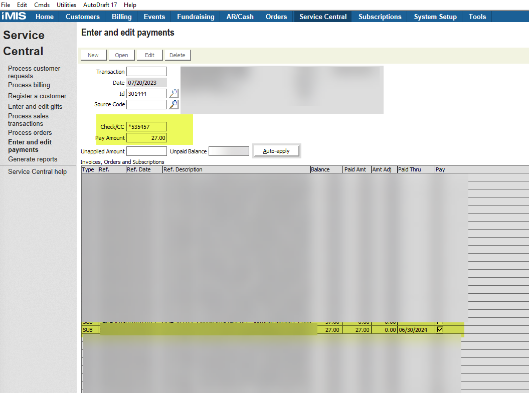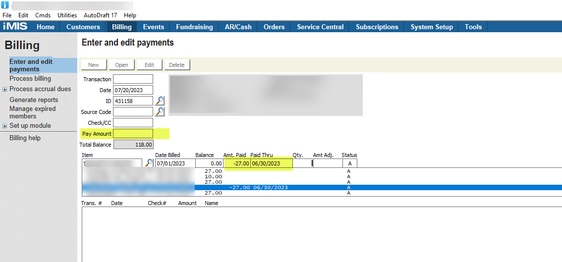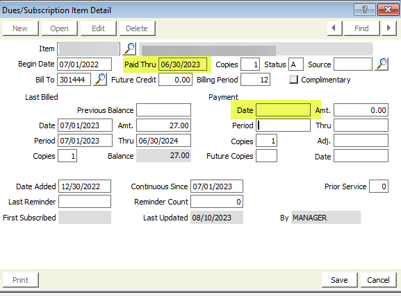 3. Highlight the subscription record under Billing and Edit the Paid Thru and Payment Date (set the Paid Thru to the old Paid Thru and erase the Payment Date)