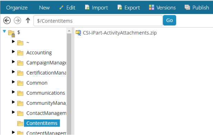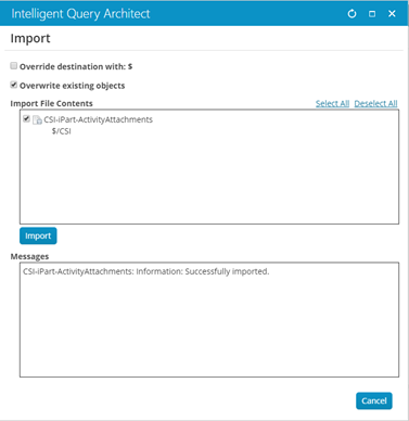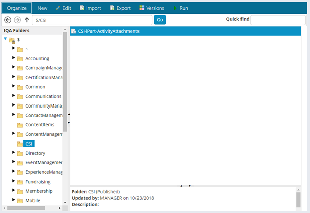 7. Open the newly created CSI folder, and you should see the CSI-iPart-ActivityAttachments IQA has been imported successfully.