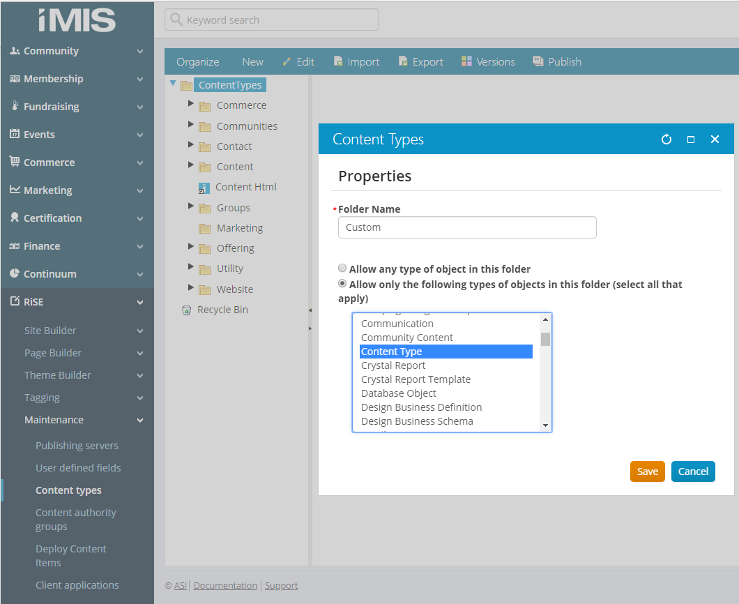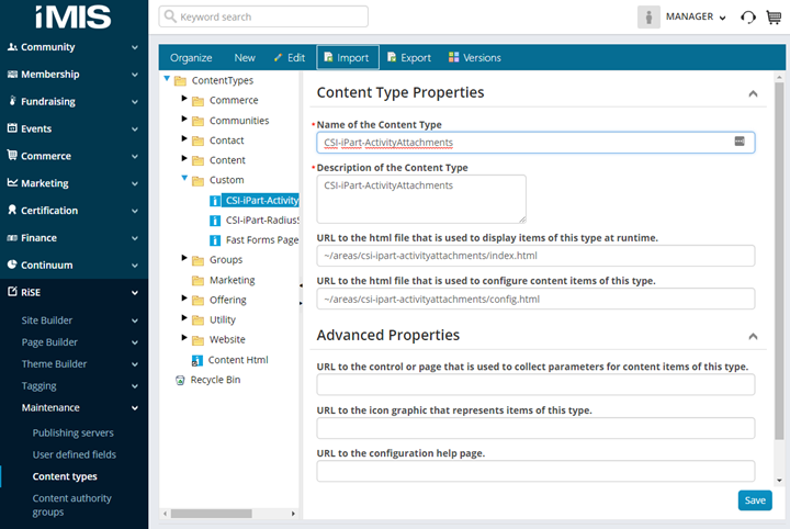 In the iMIS Staff site, go to RiSE > Maintenance > Content types.