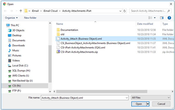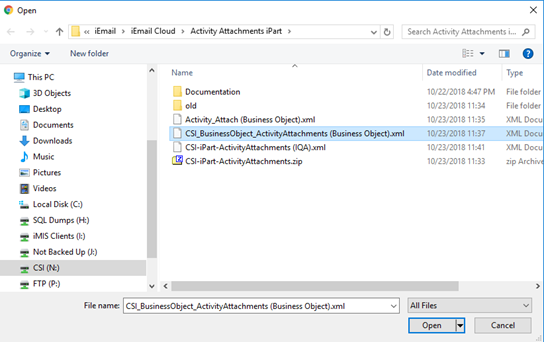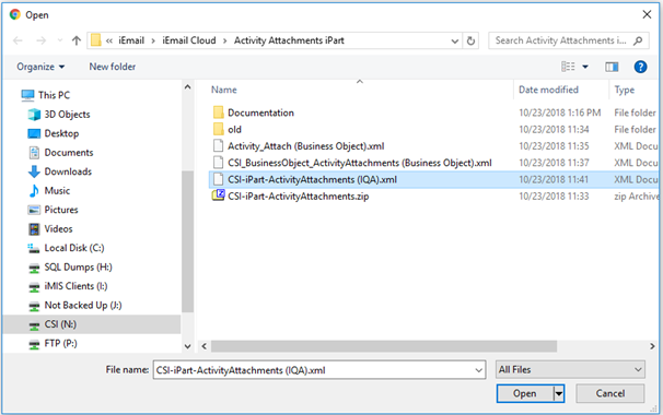 3. From the unzipped folder from CSI that you did in the beginning of these instructions, select the file CSI-iPart-ActivityAttachments (IQA).xml. Click the Open button.