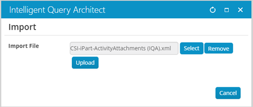 Repeat steps 1 through 10 for each IQA in the unzipped folder. This should the following: CSI_iPart_ActivityAttachments_GetAttachments(IQA).xml